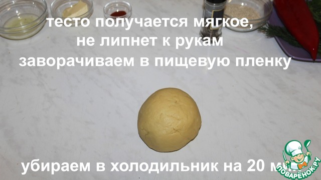 Тесто получается мягкое и не лепнет к рукам. Заворачиваем в пищевую пленку и убираем в холодильник на 20 минут.