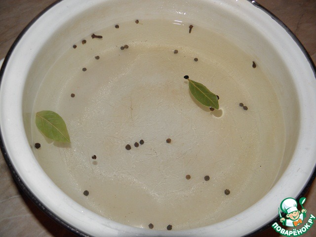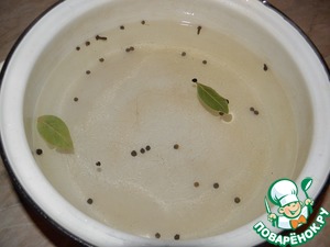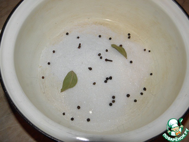 Для рассола: в посуду, где будет солиться наша рыба мы отмеряем и высыпает соль и сахар, добавляем перец черный горошком, лавровый лист и гвоздику
