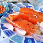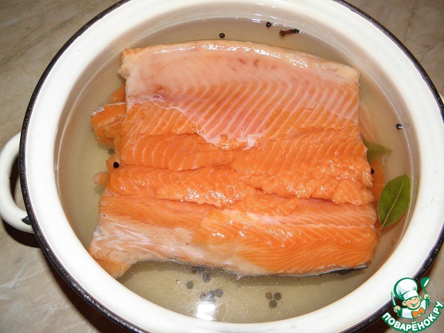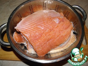Когда время подошло, достаем куски рыбы из рассола и даем стечь всей лишней жидкости.