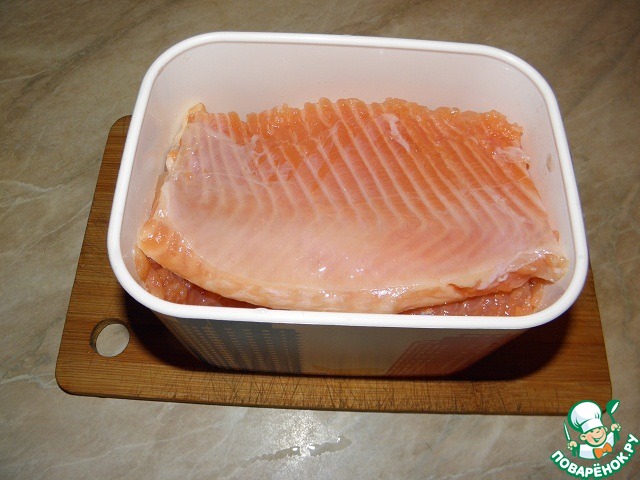 Красную рыбу освобождаем от костей (кожу оставляем), режем по назначению, в данном случае я делала бутербродный вариант, поэтому тушку разрезала вдоль пополам, а потом еще на две части поперек (длина такая, чтобы в контейнер потом уместилась) а можно разрезать целую рыбу и поперек просто стейками (тогда кости удалять не надо) этот вариант хорош с картошкой и просто сам по себе)