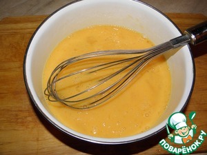 Выливаем яичную смесь к луку в сковороду и прогреваем, часто помешивая до полной готовности