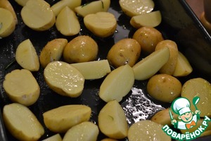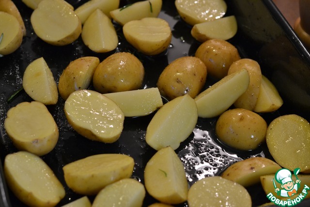 Разрезать картофель пополам, а если крупный, то на четвертинки. Выкладываем картофель в форму. Посолить и перемешать. -