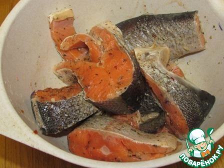 У меня форель свежезамороженная, без головы и потрошенная. Разморозила рыбу при комнатной температуре, почистила от чешуи, срезала плавники. Форель порезала порционно и приправила солью, лимонным соком и специями. У меня в состав специй входит мята, майоран, розмарин и французские травы, Вы можете использовать специи для рыбы уже в готовой расфасовке или какие Вы любите.
