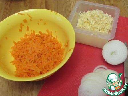 Пока рыба маринуется, потрем морковь на крупной терке, сыр на мелкой, а лук порежем тонкими колечками.