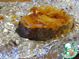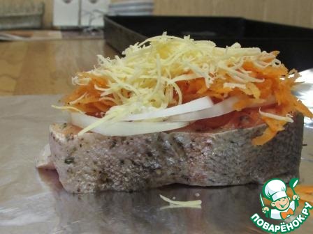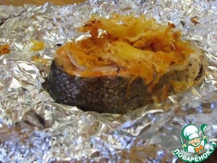 Далее выкладываю на два слоя фольги кусочек форели, на неё немного лука, моркови и сыра, сверху поливаю 1 чайной ложкой растительного масла.
