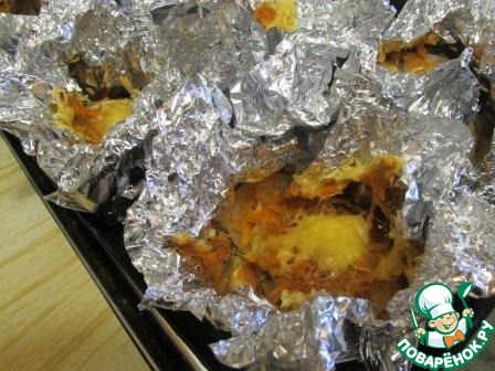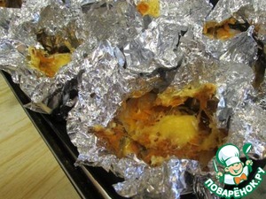 Выкладываю рыбу в фольге на противень. Ставлю в разогретую до 180 С духовку на 25 мин.