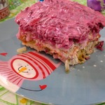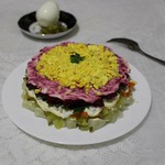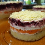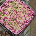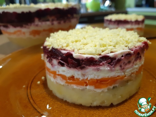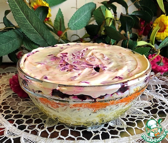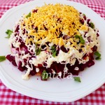 Салат по составу и подаче очень похожий на всем нам хорошо знакомую "Селедку под шубой" и "шубка" та же - из свёклы, только в этом салате "шубкой" накрываем не селедку, а соленые огурчики! Салат яркий, сочный, вкусный! Пробуем?