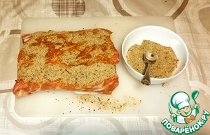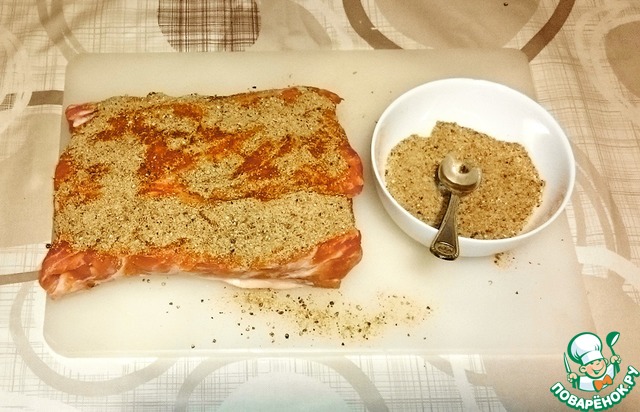 Мясо нашпиговываем чесноком и хорошо натираем смесью приправ.