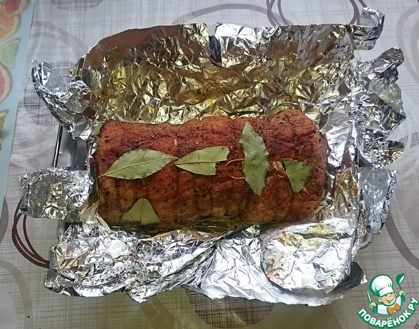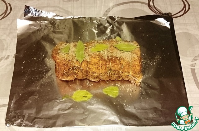 Обвязываем натертое специями мясо кулинарным шпагатом, чтобы держало форму. Сверху и по бокам кладем лавровые листики.