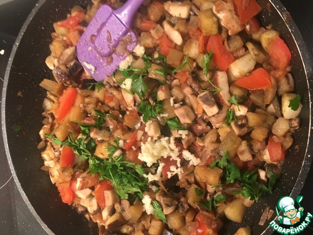 Добавляем еще масло и кидаем кубики баклажана. Мешаем постоянно. Через минуту добавляем грибы.