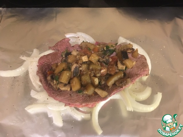 Кладем сверху кусок мяса, покрываем равномерно овощной смесью.