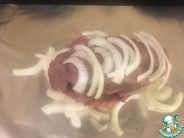 Сверху накрываем вторым куском мяса, слой лука и опять перчим. Прям по соседству делаем еще один такой "сэндвич".