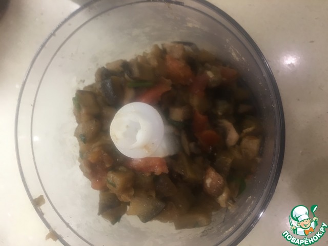 За 5 минут до готовности мяса, начинаем разогревать в сковороде оставшиеся овощи и затем прокручиваем в блендере. Это будет гарнир и соус в одном флаконе.