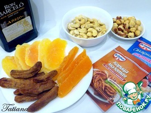 Вяленые бананы и цукаты-порежьте кусочкам, поместите в контейнер, влейте ром (ром должен полностью покрыть фрукты), закройте контейнер крышкой, уберите в прохладное место на 3 часа и более...