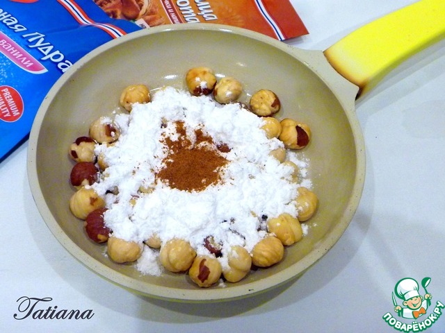 Закарамелизуйте фундук. Почищенный от кожицы фундук выложите на маленькую сковороду, сверху присыпьте сахарной пудрой и молотой корицей, нагревайте сковороду с содержимым на маленьком нагреве, постоянно помешивая. Как только сах. пудра "растает", выложите фундук на антипригарный коврик, разделяя ядрышки между собой.