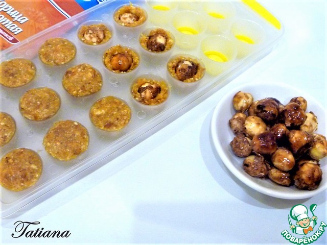 Из получившейся смеси скатайте маленькие шарики, или сформируйте конфеты в маленьких формах. Вложите ("утопите")в середину каждой конфеты карамельный фундук. Формочки заверните в пищевую пленку, уберите в морозильную камеру на 10 и более часов.
