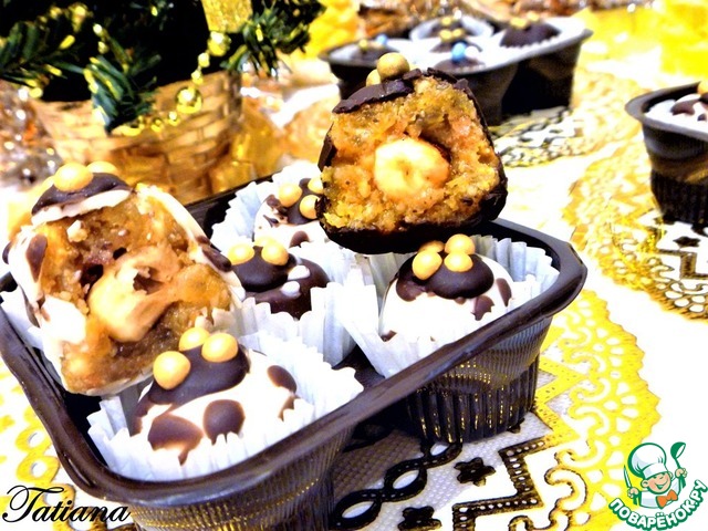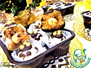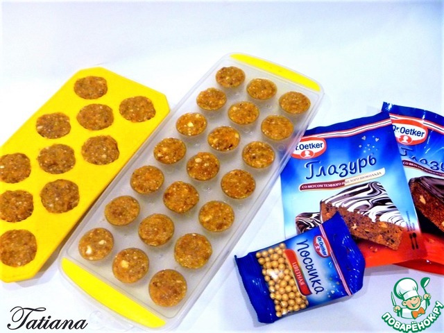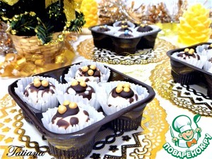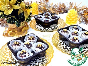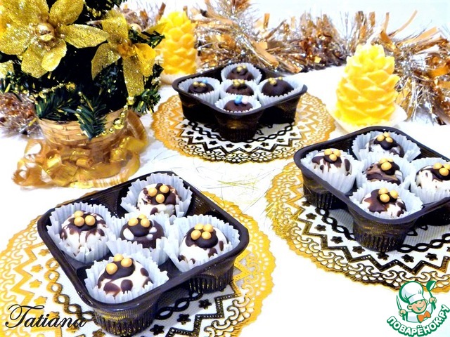 Хорошо охлажденные конфеты покройте шоколадной глазурью (темной, белой-по желанию). Для удобства глазирования поместите глазурь в термостойкую чашку, нагрейте в микроволновке (80% 1 минуту), глазурь должна быть, жидкая, однородная и глянцевая. Разделочную доску оберните пищевой пленкой. Конфеты погружайте в растопленную глазурь, равномерно обваляйте, выньте конфету чайной ложкой на разделочную доску, пока глазурь не застыла, украсьте верх конфеты кондитерской посыпкой (золотыми шариками). Глазируйте по одной конфете, так как глазурь застывает быстро. У застывших конфет острым ножом подровняйте дно (срежьте подтекшую глазурь).