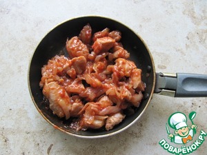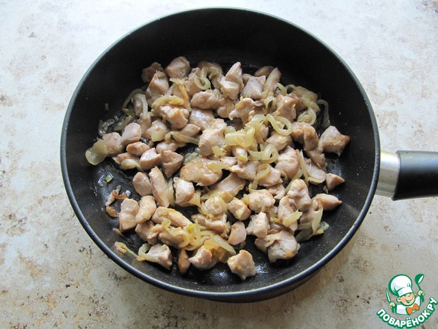 Куриное филе нарезать мелким кусочком, посолить, поперчить, обжарить на растительном масле с луком до готовности.