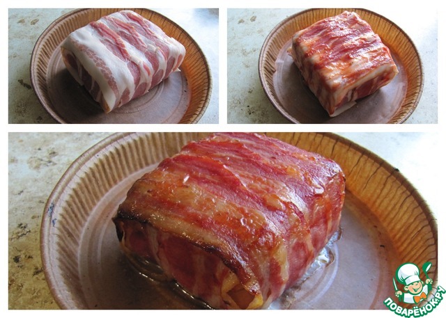 Обернуть сэндвич полосками бекона со всех сторон, обмазать кетчупом (это придаст бекону красивый цвет). Запечь под грилем до румянца.