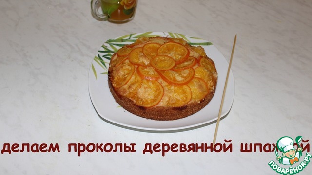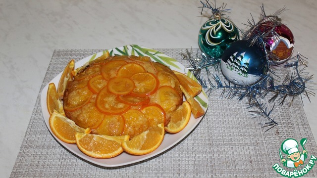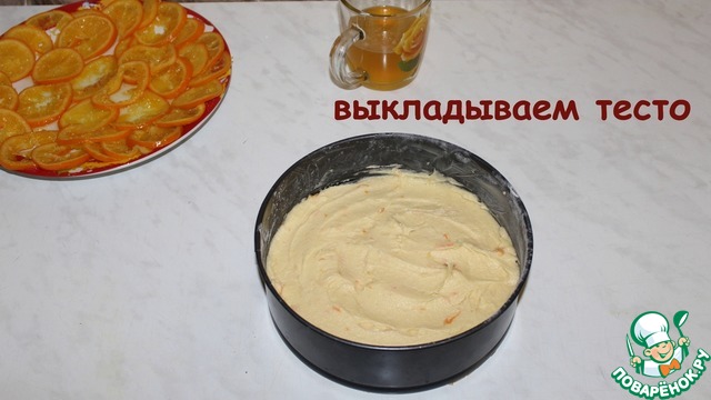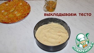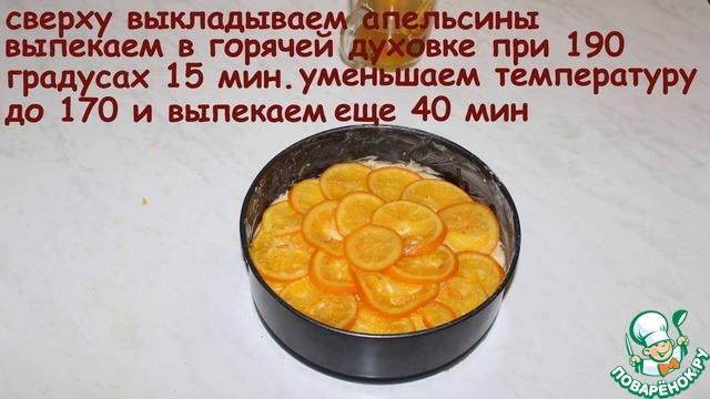 Сверху выкладываем апельсины. Выпекаем в горячей духовке при температуре 190 градусов 15 минут. Уменьшаем температуру до 170 градусов и выпекаем еще 40 минут.