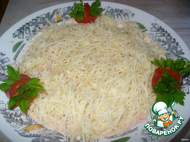 И такими корзиночками можно украсить или горячее блюдо (мясо или курицу), или салаты. Я украсила, в данном случае, свой салат "Новинка" (помидоры с сыром).