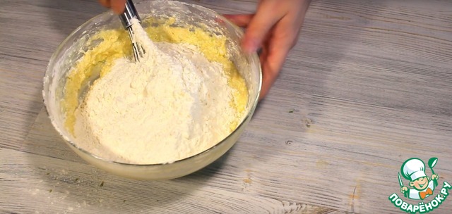 Соединяем яично-масленую часть с мукой. Хорошо перемешиваем. -
