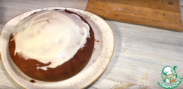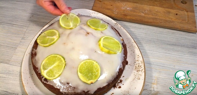 Для глазури смешиваем сахарную пудру (150 гр.) с соком лайма (примерно 1-2 ст. л.). Сок лайма можно заменить на воду. Должна получиться белая, плотная консистенция. Смазываем пирог глазурью. Даем застыть.