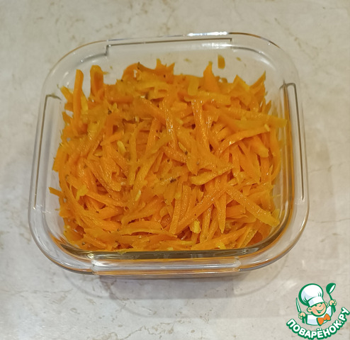 Отделяем лук от растительного масла. Ароматизированное горячее масло выливаем на специи и хорошо перемешиваем морковь. Накрываем крышкой или пленкой и даем постоять в холодильнике 2 часа.