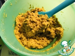 К этой массе добавить кокосовую муку, разрыхлитель, сахар, ваниль