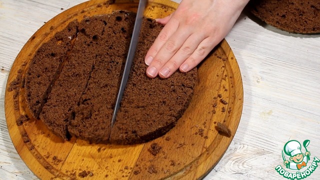 Разрезаем корж на 3 на части. Первый корж оставляем.