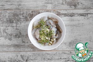 Очистите креветки от панциря, разрежьте вдоль пополам, удалите темную кишечную вену. Посолите креветки, поперчите, добавьте рубленый чеснок и листочки тимьяна, оставьте мариноваться, пока готовится все остальное.