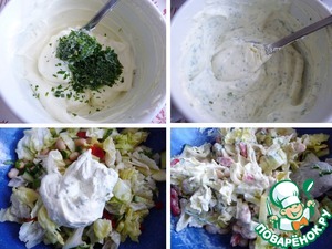 Для заправки смешать горчицу, сливочный сыр, сметану,