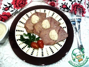 Мясо нарезать тонкими ломтиками и полить соусом.
