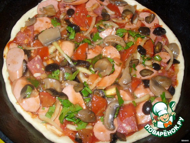 Начинка: Нарезать сосиски кружочками. Если есть другие колбасные изделия - их нарезать кубиками или пластинами. Луковицу очистить и нарезать полукольцами. Если шампиньоны нарезаны крупно, то порезать мельче. Маслины нарезать кружками, помидоры - кубиками. Всё перемешать, добавить пропущенный через пресс чеснок и рубленную зелень. Заправить соевым соусом, добавить немного растительного масла и кетчуп. Соль и черный молотый перец (лучше свежемолотый, а еще лучше, смесь перцев). Перемешать.