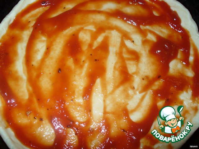 Немного смазать тесто растительным маслом (сбрызнуть) и равномерно сверху намазать кетчупом.
