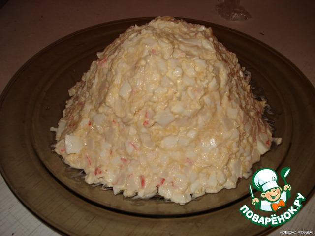 • Всё тщательно перемешать заправить майонезом ( можно ещё для заправки добавить 2 ст. л. лимонного сока). Выложить горкой.