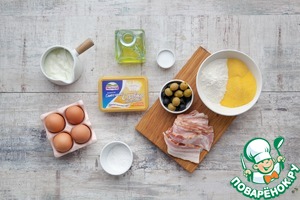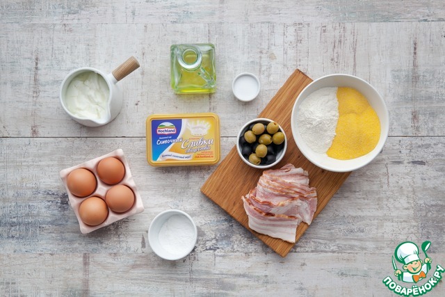 Ингредиенты для «Сырно-кукурузные маффины с беконом, маслинами»: