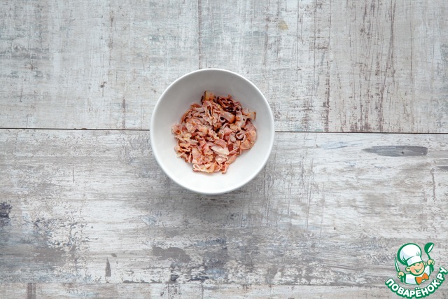 Разогрейте духовку до 180 °С. Нарежьте бекон небольшими кубиками. Выложите бекон на сковороду и поставьте на средний огонь, обжарьте на сильном огне, 3 мин.