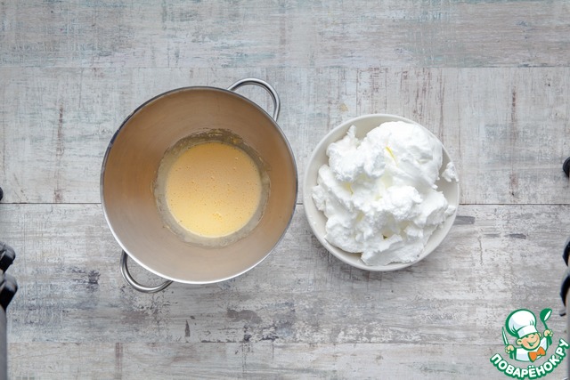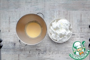 Отделите белки от желтков. Взбейте желтки с 2–3 ст. л. оливкового масла. Белки взбейте отдельно в крутую пену.