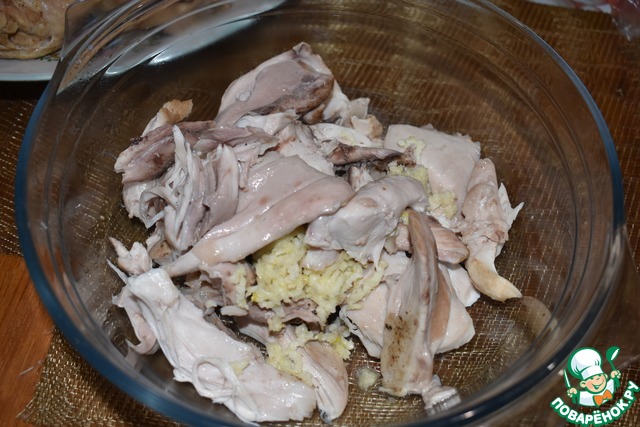 Курицу отварить в подсоленной воде до готовности, сняв пену. Курицу достать из бульона, разобрать на порционные куски и выложить в емкость с крышкой. Я для этого рецепта курицу всегда отделяю от кожи и костей, так мясо получается более пикантное и пропитанное соусом.