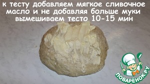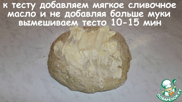 К тесту добавляем мягкое сливочное масло и не добавляя больше муки, вымешиваем тесто 10-15 минут.