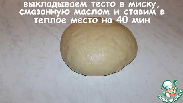 Выкладываем тесто в миску, смазанную растительным маслом и ставим в теплое место на 40 минут.