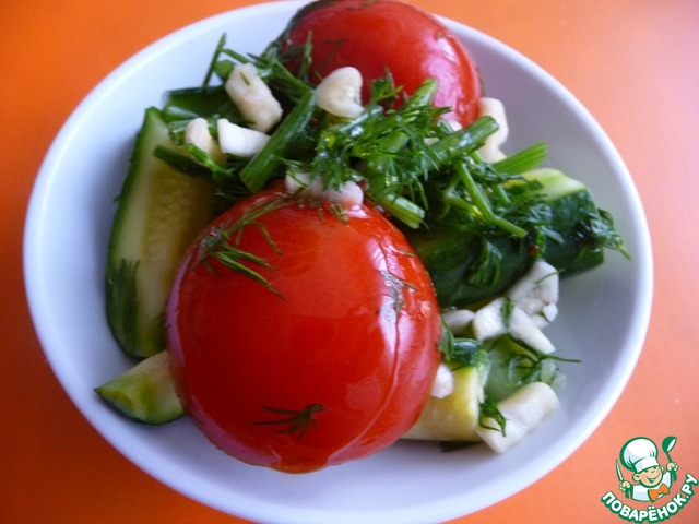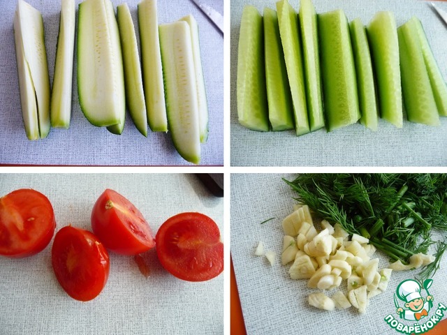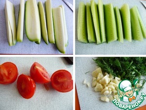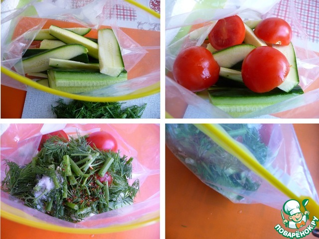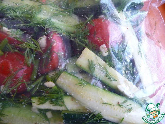 В пакет сложить цуккини, огурец, помидоры, чеснок, укроп,