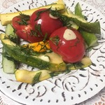 Сверху выложить маринованные овощи, заправить оливковым маслом.