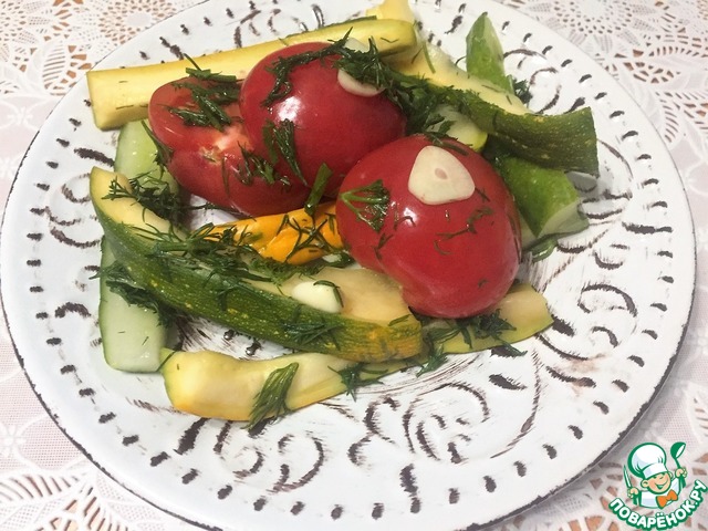 Малосольные огурчики в пакете с цуккини и помидорами. Очень вкусно, особенно с картошечкой. Прекрасное дополнение к шашлыку, печеному мясу. Всё просто и быстро. К маринованным овощам добавила немного свежей капусты. Овощи сочные, свежие, ароматные, пикантные, вкусные. Для засолки использовала парниковые овощи.