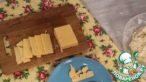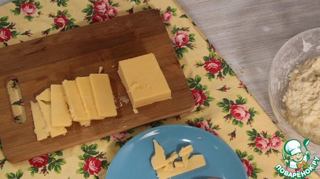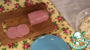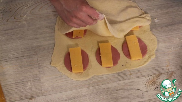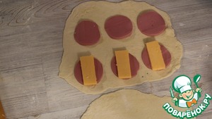 На 1 часть теста выкладываем начинку (колбасу, сыр).