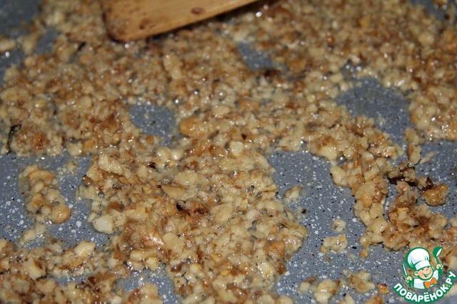 На масле обжарить чеснок, добавить к нему орехи. Жарить около трех минут.