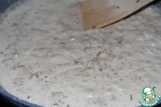 1 ст. л. муки смешать со сметаной и добавить к орехам. Посолить, добавить специи для курицы, карри. Если соус будет густым - разбавить водой или бульоном.