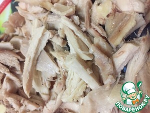 Отварить 1 окорочок и потом разрезать на кусочки. Не выливайте бульон, он нам еще понадобится!
