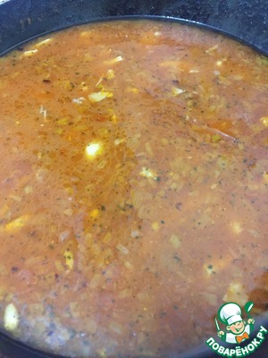 В сковородку с поджаренным лучком добавить окорочок, молотый красный перец и чайную ложку томатной пасты, можно добавить приправы по вашему вкусу (я добавила сушёную петрушку). Слегка обжариваем это всё меньше минуты. Затем добавляем куриный бульон по вкусу. Кому больше нравятся супы - добавляйте больше бульона, если хотите чтобы получилось второе блюдо - тогда бульона меньше.